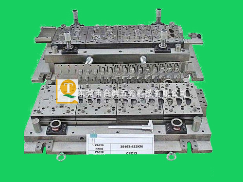c.級進模(也稱連續(xù)模)在毛坯的送進方向上,具有兩個或更多的工位,在壓力機的一次行程中,在不同的工位上逐次完成兩道或兩道以上沖壓工序的模具。